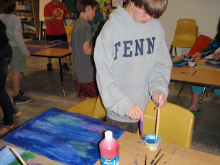 First and second grade students read "Cactus Hotel," by Brenda Guiberson. They use watercolors to paint a sunset sky, using the wash technique. After the sky was dry, they painted silhouettes of different types of cacti and desert creatures. Beautiful!